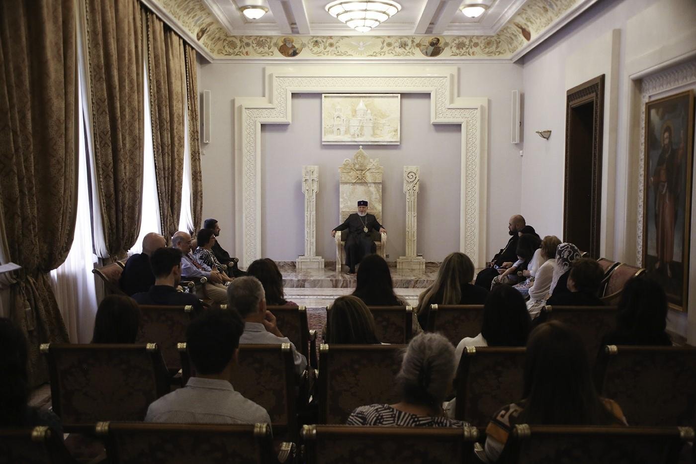 Տեր Մեսրոպը, հայցելով Նորին Սրբության օրհնությունը, ներկայացրեց ուխտավորաբար Մայր Աթոռ ժամանած հավատացյալներին։