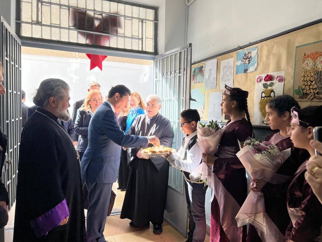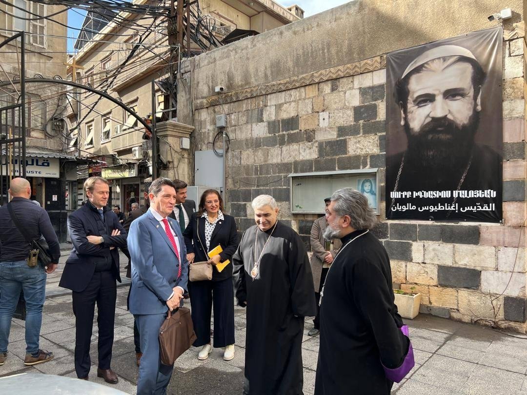 Մեծարգոյ հիւրին ընկերակցած է Սուրիոյ մէջ Ֆրանսայի դեսպանատան գործակատար Ժան-Բաթիստը, խորհրդատու տիկին Նատիա Շայիան եւ «Օգնութիւն Արեւելքի Քրիստոնեաներուն» կազմակերպութեան ներկայացուցիչ Վանսան Ժիլոն։