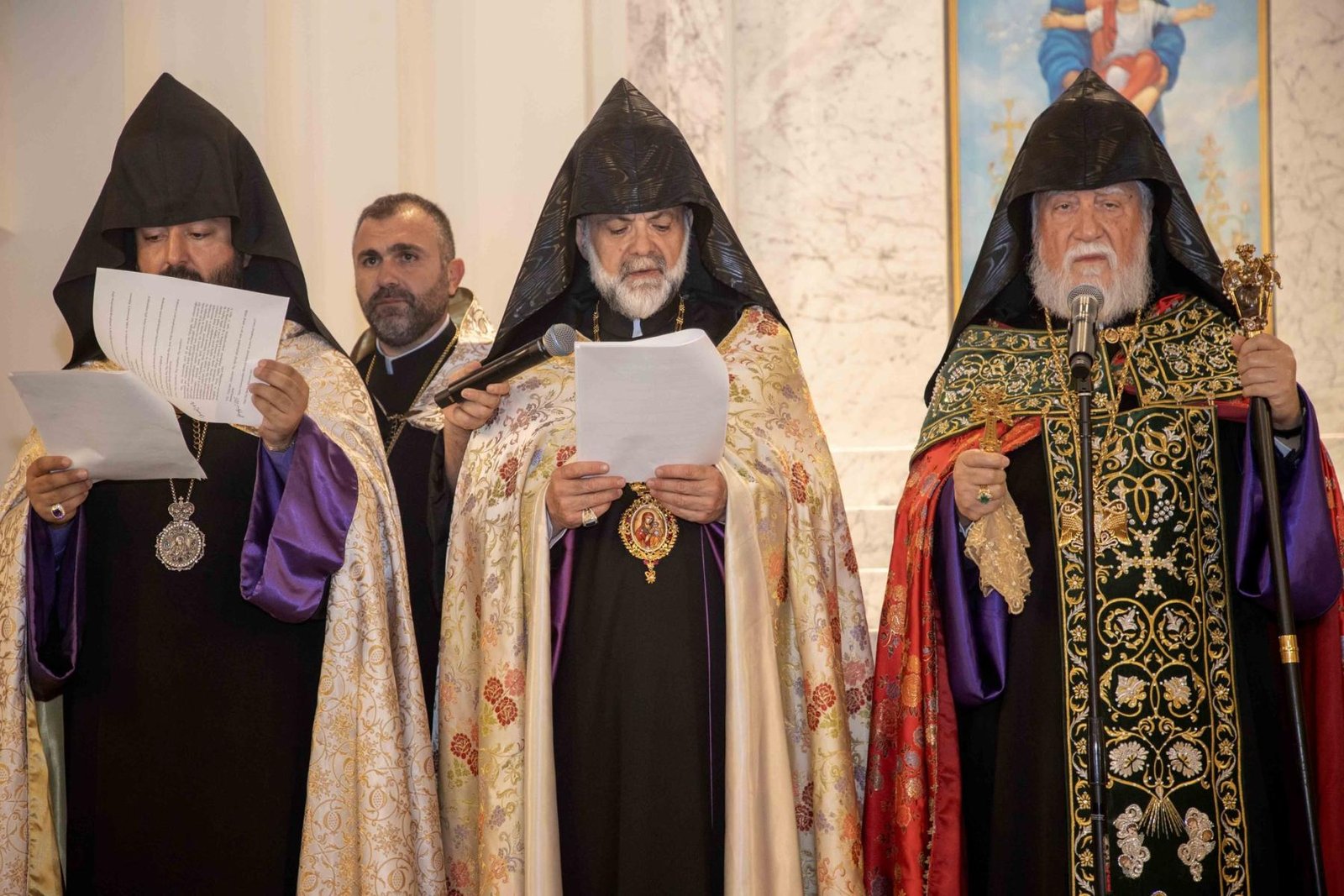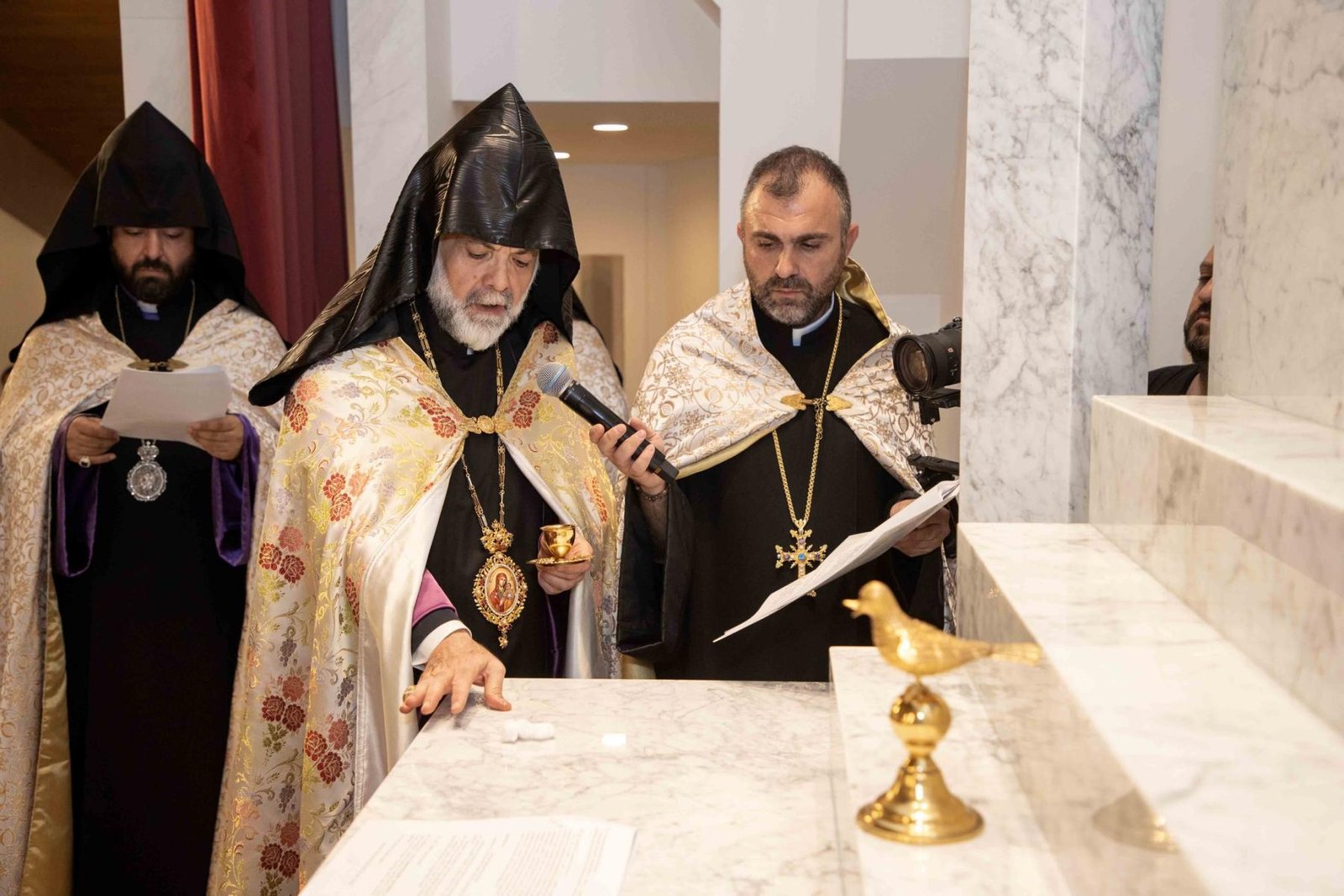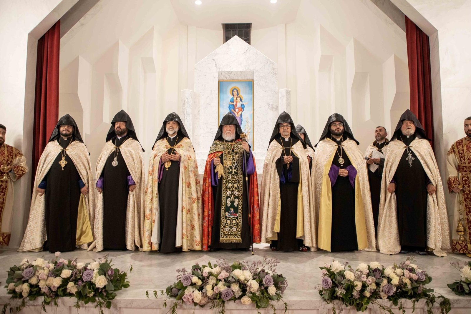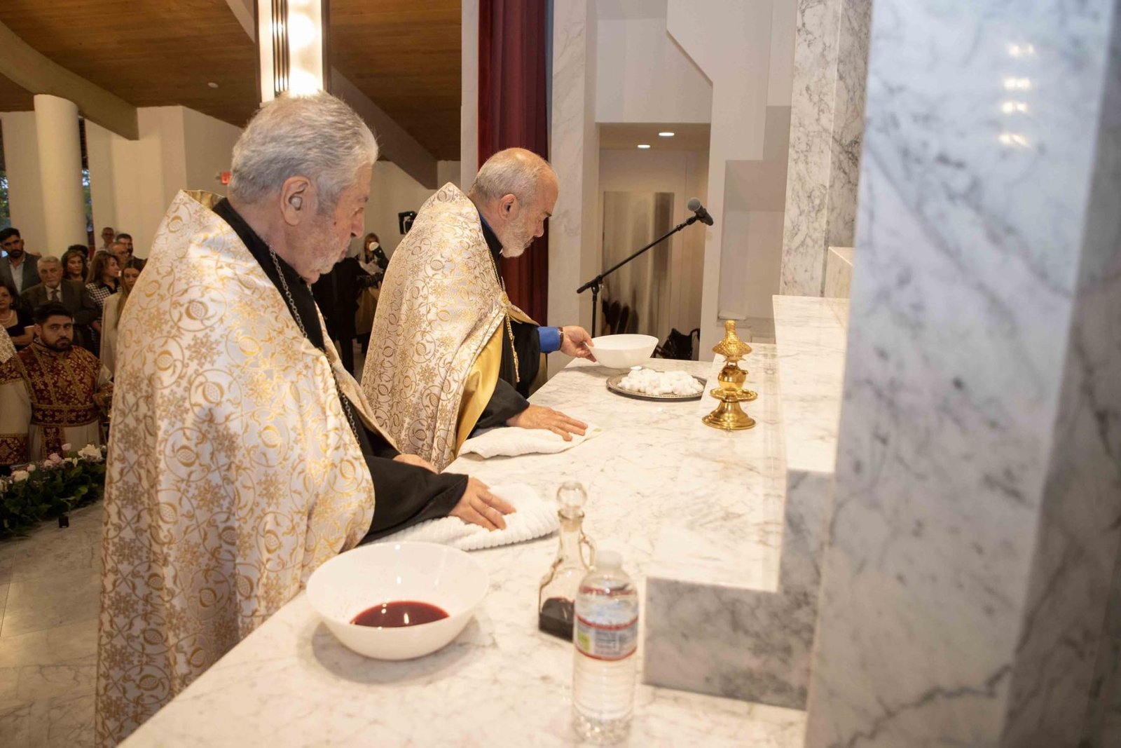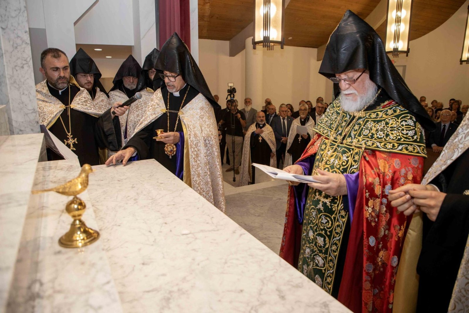 Օծման հոգեպարար արարողութենէն ետք, Արեւմտեան հայոց թեմի առաջնորդ Գեղամ արքեպիսկոպոս Խաչերեան ըսաւ, թէ խանդավառութեամբ, ուրախութեամբ ու ոգեւորութեամբ լեցուն պահեր կ՚ապրինք՝ այս նորաօծ խորանին դիմաց կանգնած հաւատաւոր զաւակները մեր ազգին: Վեհափառ Հայրապետը այցելեց զանազան եկեղեցիներ, սակայն այսօր Սրբոց Հրեշտակապետաց եկեղեցւոյ մէջ Նորին Սրբութեան այցը տարբեր հմայք ու հոգեկան անբացատրելի հրճուանք կը պատճառէ բոլորիս: Այսօր, այս վայրը, ձեռամբ Նորին Սրբութեան, ընծայուեցաւ Աստուծոյ եւ պիտի օգտագործուի մեր ազգի ծառայութեան՝ Աստուծոյ կամքին համաձայն: Մեր խորին երախտապարտութիւնը կը յայտնենք մեր ազգի եկեղեցասէր ժողովուրդին եւ յատկապէս բարերար Մելքոնեան ամոլին, որ առանց վարանելու իր նիւթաբարոյական օժանդակութիւնը հայթայթեց այս խորանի բարձրացման եւ եկեղեցւոյ վերաշինութեան: Յանուն թեմիս զաւակներուն ի սրտէ շնորհակալութիւն կը յայտնենք Վարանդ եւ Հուրի Մելքոնեանին: