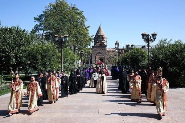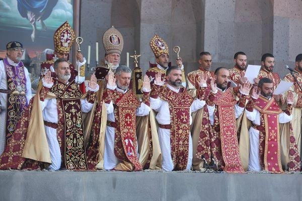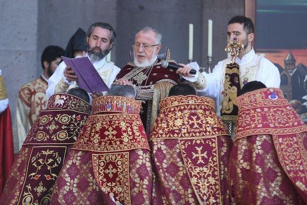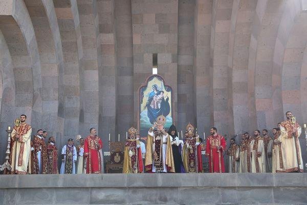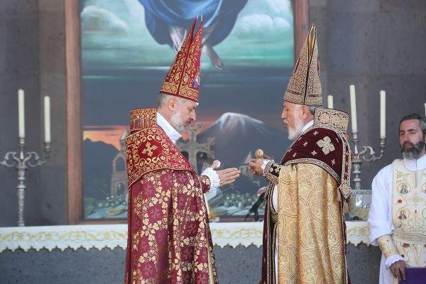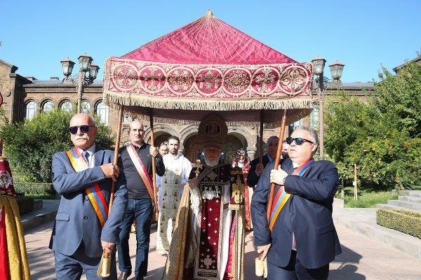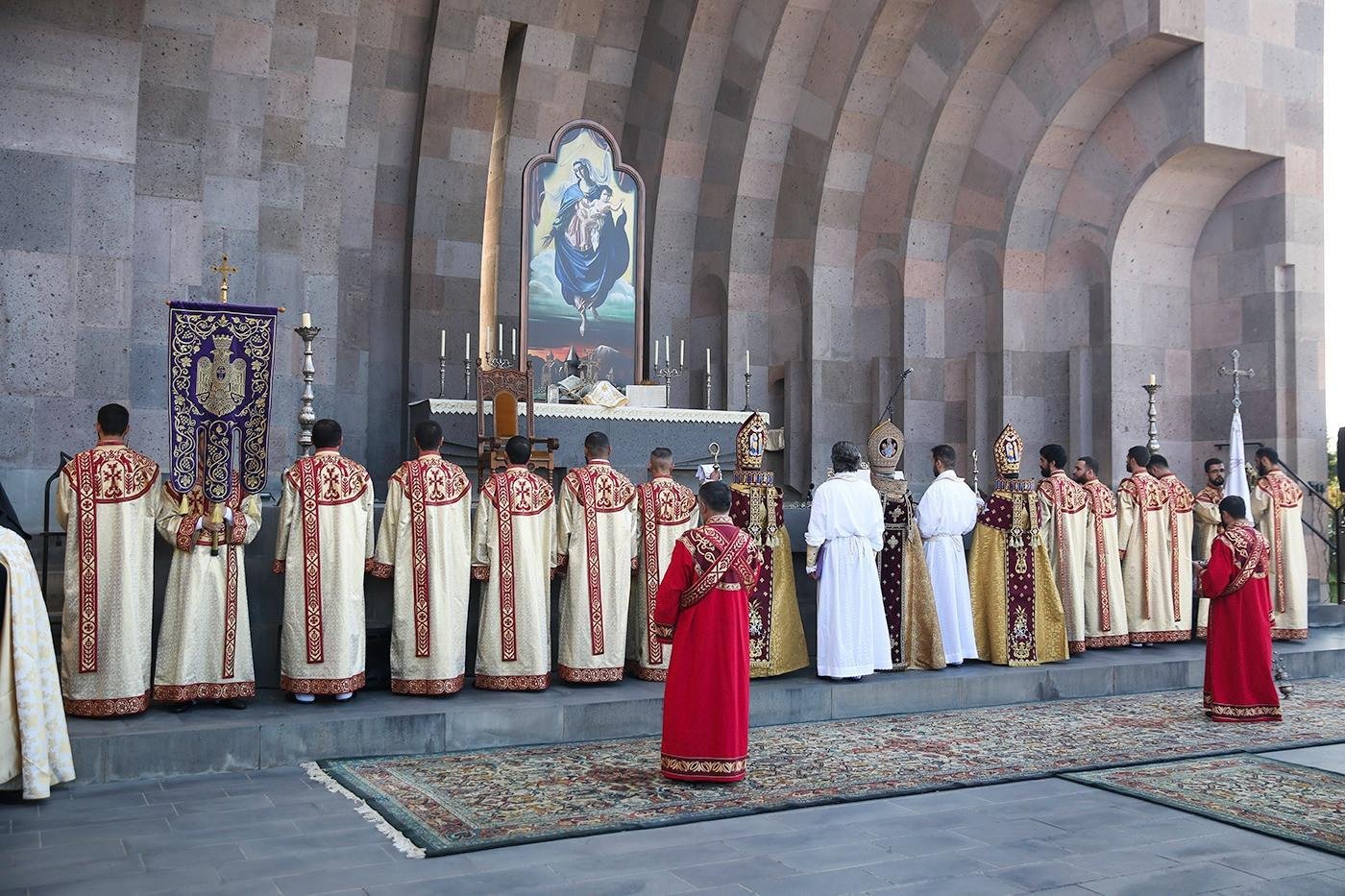 Սուրբ Պատարագը սկսվեց Հայրապետական հանդիսավոր թափորով, որով ամպհովանիի ներքո Ամենայն Հայոց Կաթողիկոսն առաջնորդվեց դեպի Սուրբ Տրդատի բաց խորան, որտեղ սկսվեց սրբազան Խորհուրդը: Առընթերականերն էին Շիրակի թեմի առաջնորդ Գերաշնորհ Տ. Միքայել արքեպիսկոպոս Աջապահյանը և Արցախի թեմի առաջնորդ Գերաշնորհ Տ. Վրթանես եպիսկոպոս Աբրահամյանը, խարտավիլակն էր Ավստրալիայի և Նոր Զելանդիայի հայոց թեմի առաջնորդ, Հնդկաստանի և Ծայրագույն Արևելքի Հայրապետական պատվիրակ Գերաշնորհ Տ. Հայկազուն արքեպիսկոպոս Նաջարյանը:
