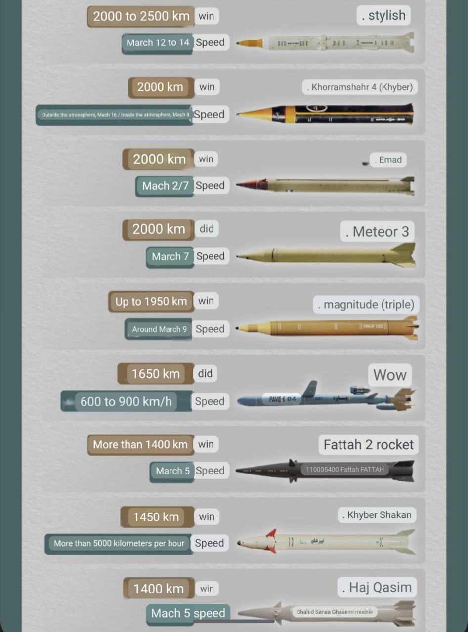 Իրանի պետական ISNA գործակալությունը հրապարակել է այն հրթիռների ցանկը, որոնց հեռահարությունը թույլ է տալիս հարվածել Իսրայելի թիրախներին։ Գործակալության հրապարակած ինֆոգրաֆիկայում ներկայացված են «Սաջիլ», «Խորրամշահր 4», «Էմադ», «Շահաբ 3», «Գադր», «Խեյբար Շեկան» և «Հաջ Քասեմ» բալիստիկ հրթիռները, ինչպես նաև «Պավե» և «Ֆաթթահ 2» թևավոր հրթիռները: