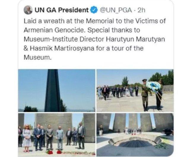 ՄԱԿ-ի գլխաւոր վեհաժողովի նախագահ Ապտուլլա Շահիտը Twitter-ի իր էջէն հեռացուցած է Ծիծեռնակաբերդ կատարած այցի մասին գրառումը։