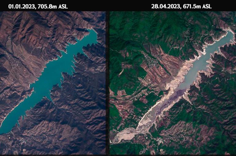 Կից՝ Սարսանգի ջրամբարի արբանեակային լուսանկարները՝ 2023թ. յունուարի 1-ի եւ ապրիլի 28-ի դրութեամբ՝ ծովի մակարդակից համապատասխանաբար 705.8 եւ 671.5 մետր բարձրութեամբ մակերեւոյթով»: