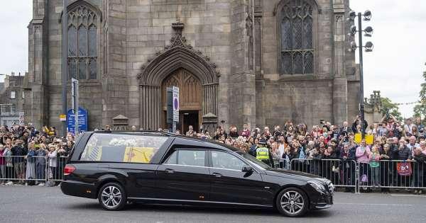 Ինչպէս կ'երեւայ Sky News-ի հեռարձակումէն, դիակառքը դիմաւորած են Շոթլանտայի թագաւորական գունդի անդամները: