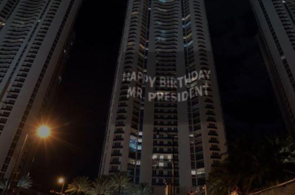 Ընկերային ցանցերու մէջ տարածուած են լուսանկարներ ու տեսանիւթեր, որոնց մէջ երեւցած է, որ Մայամիի Trump Tower շէնքի վրայ Ռուսիոյ Դաշնութեան նախագահ Վլատիմիր Փութինին նուիրուած շնորհաւորանք յայտնուած է։