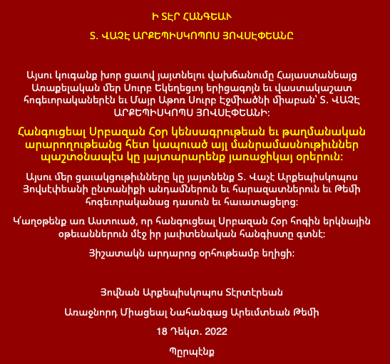 Այսու կուգանք խոր ցաւով յայտնելու վախճանումը Հայաստանեայց Առաքելական մեր Սուրբ Եկեղեցւոյ երիցագոյն եւ վաստակաշատ հոգեւորականերէն եւ Մայր Աթոռ Սուրբ Էջմիածնի միաբան՝ Տ․ ՎԱՉԷ ԱՐՔԵՊԻՍԿՈՊՍ ՅՈՎՍԷՓԵԱՆԻ։