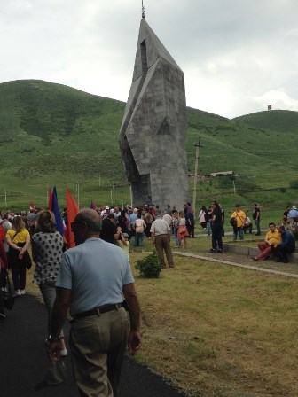 Մինչեւ Յուշահամալիր բաւական երկար ճամբայ է։ Մեր բազմամարդ խուբին մէջ կան ամէն տարիքի մարդիկ, բայց բոլորս ալ յամառօրէն կը յառաջանանք։ Յուշահամալիրն ալ բազմամարդ է։ Կ’ուղղուինք դէպի Դրոյի դամբանը, որ Ապարանի եռամաս Մեծ Եղեռնի նահատակներուն, Բաշ Ապարանի հերոսներու յիշատակին եւ Երկրորդ Համաշխարհային Պատերազմին զոհուածներուն նուիրուած յուշակոթողէն քիչ մը անդին է։ Սեւ Տուֆէ այս յուշարձանը բլուրի գագաթին է եւ բաւական տպաւորիչ։ Բազմաթիւ պատանեկան եւ երիտասարդական խուբեր, զանազան քաղաքներէ եւ գիւղերէ եկած են իրենց յարգանքի տուրքը մատուցելու մեր նահատակներուն։ Կը նկատեմ Դալինի եւ Վարդենիսի Երկրապահներու ցուցանակները։ Կան բազմաթիւ ընտանիքներ, իրենց երախաները կարգերու մէջ զետեղած, կը քալեն դէպի Յուշահամալիր։ Կ’ենթադրեմ, որ նկատի ունենալով, որ Մայիսի 28-ին ամէնուն ուշադրութիւնը կը կեդրոնանայ Սարդարապտի վրայ, Ապարանի տօնակատարութիւնները այսօր են։ Դրոյի դամբանին շուրջ կ’ըլլան խօսքեր եւ ազգային երգեր։ Յուշարձանի փէշին կայ հրապարակ, ուր հաւաքուած է մեծ բազմութիւն։ Պատարագէն ետք կը սկսին երգն ու պարը, զանազան խումբերու մասնակցութեամբ։