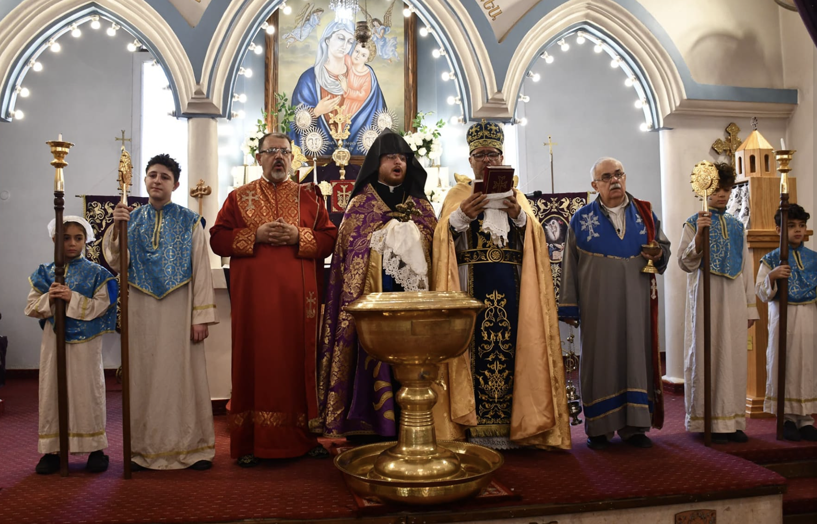 «Ամէն եւ Ընդ Հոգւոյդ Քում» աղօթքէն ետք, Հոգեշնորհ Հայր Սուրբը Ս. Գէորգի մասունքով թափօրով վերադարձաւ խորան եւ կատարեց Ջուրի Օրհնութիւնը։
