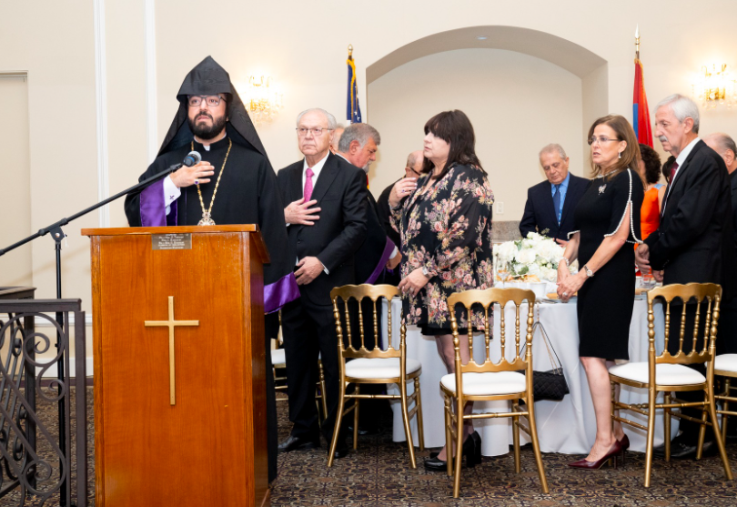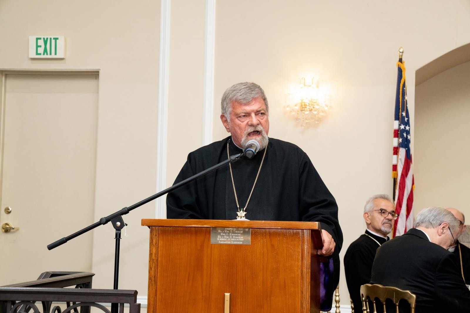 Ս. Խաչ Մայր տաճարի Հոգեւոր տեսուչ՝ Գերպ. Տ. Միւռոն Ծ. Վրդ. Ազնիկեան, իր խօսքին մէջ վեր առաւ Հայ Եկեղեցւոյ պատմական դերը՝ ազգի գոյութենական պայքարի ճամբուն վրայ եւ մինչեւ մեր օրերը՝ նշելով, որ Արարատի երկրէն հազարաւոր մղոններ հեռու՝ Խաղաղականի այս օտար ափերուն դար մը եւ աւելի տարիներ առաջ հասած գաղթական հայ բեկորներ, բազում զրկանքներով, աննկուն կամքով, բայց մանաւանդ անբեկանելի հաւատքով ու նիւթական եւ բարոյական մեծ զոհողութիւններով, 1922-ին կառուցեցին լոյսի ու հաւատքի խորան՝ Ս. Խաչ եկեղեցին, որուն կեանքը այսօր կը շարունակուի մեր բոլորին սիրելի Ս. Խաչ Մայր տաճարի եւ յարակից բոլոր մասերով, ապա հրաւիրեց Առաջնորդ Սրբազանը՝ փոխանցելու իր պատգամը: