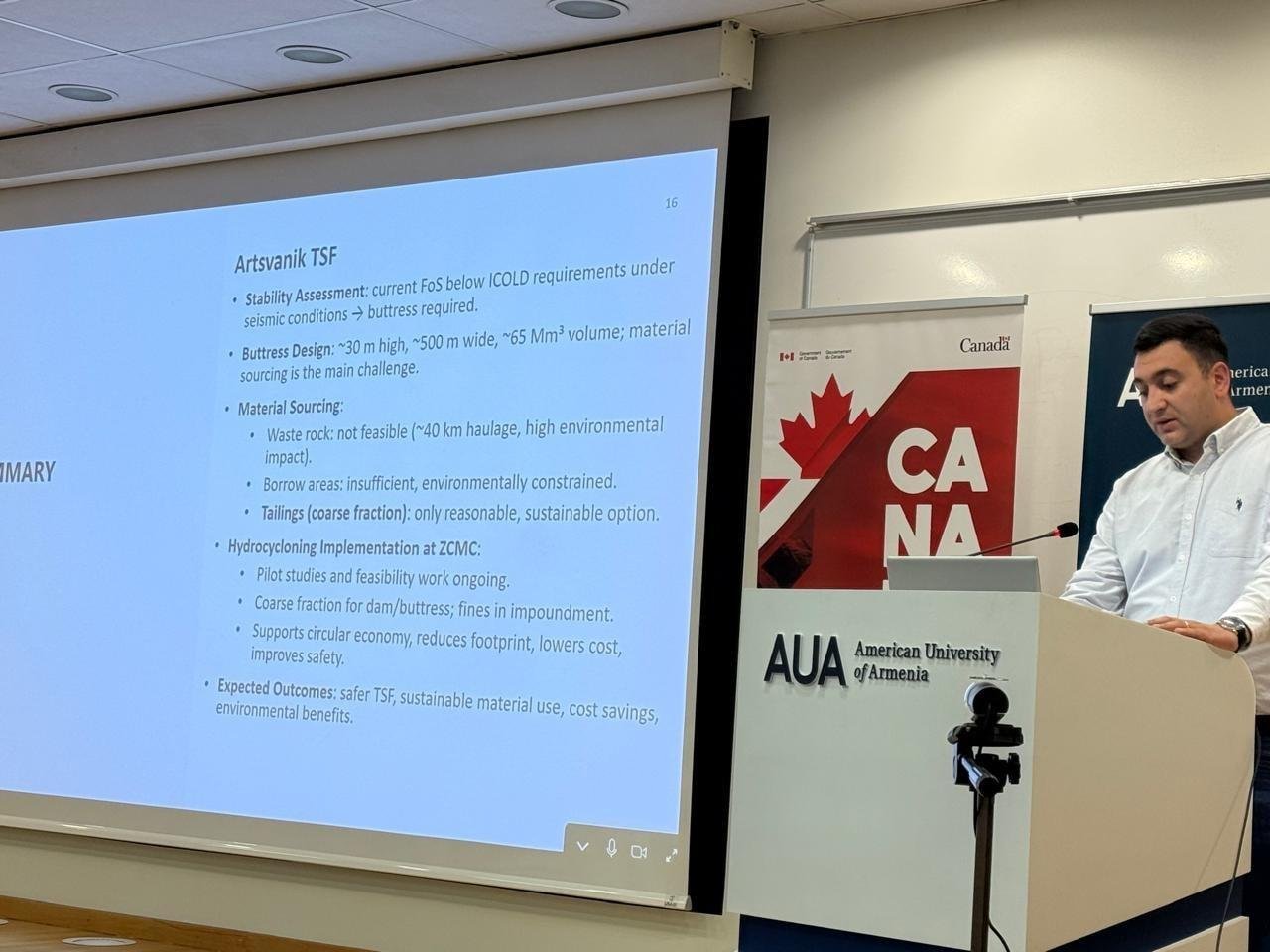 ԶՊՄԿ-ի Ջրային միջոցներու բաժնի ղեկավար Արմենակ Սահակեան ծաւալուն ելոյթ մը ունեցաւ՝ ներկայացնելով պոչամբարներու (պոչանքային ամբարտակ) կառավարման արդի մօտեցումները, որոնք հիմնուած են հիդրոցիկլոնաւորման (ջրապտտումացման) նորարարական արհեստագիտութեան վրայ։ Այս մեթոտները ոչ միայն նուազեցուցած են ծախսերը, այլեւ՝ խթանած թափոններու վերաօգտագործումը՝ միաժամանակ ապահովելով միջազգային ICOLD եւ GISTM չափանիշերուն համապատասխան անվտանգութիւն։