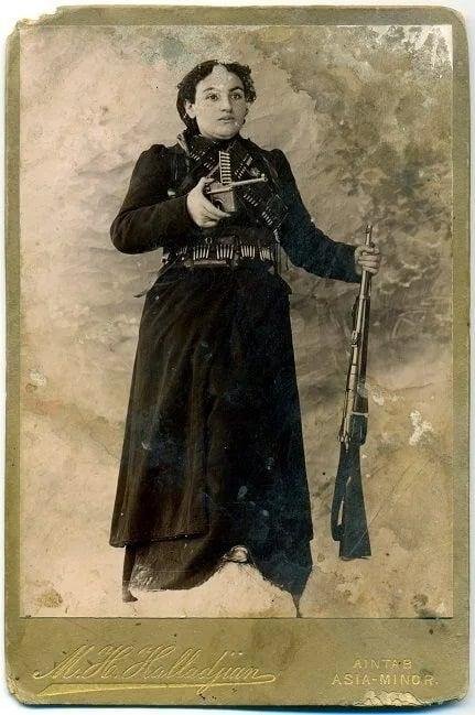 Լուսանկարին մէջ Հեղինէ Չաուշի մէկ ձեռքին ատրճանակ կայ, միւսին՝ հրացան, կուրծքին եւ գօտիին կապուած են փամփշտակալներ։ Լուսանկարը քաշուած է ամուսնոյն մահէն ետք, 1910-ին, Այնթապի՝ “M. H. Halladjian” լուսանկարչատան մէջ։