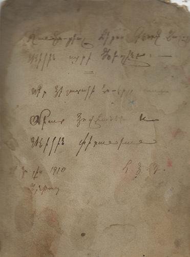 Լուսանկարի դարձերեսին ձեռագիր ընծայագիր կայ․ «Հանգուցեալ հերոս Գէորգ Չաուշի տիկին այրի Հեղինէ։ Մեր յիշատակի նուէրը [անընթեռնելի բառ] Տիար Յովհաննէս եւ տիկին Փիդանեան․ 21 Յուլիս, 1910, Հ․Յ․Դ․, Այնթապ»։