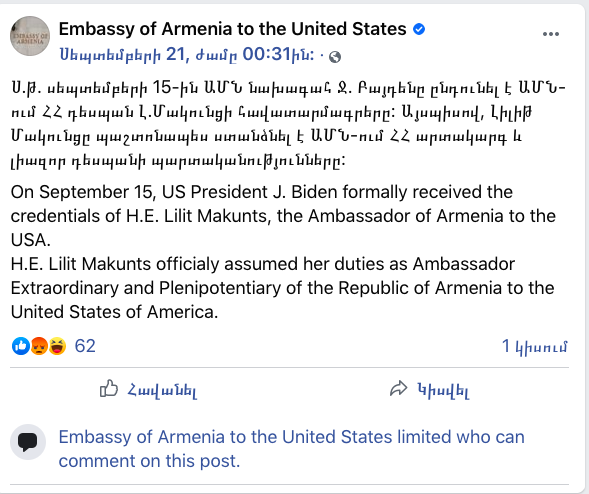 Նախօրօք գրած էինք այն մասին, որ մասնաւորապէս ամերիկահայութեան շրջանակներուն մօտ մեծ վրդովմունքով ընդունուած էր Լիլիթ Մակունցի դեսպան նշանակուելու որոշումը։